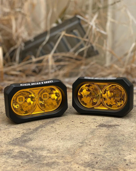 GP20 LED Pods, our low profile driving light with flood beam pattern. These feature an unshatterable poly carbonate lens, durable powder coat finish, powerful twin 10w HP-5 LED chips, DT connector built into the housing and stainless steel bracket. Keeps your line of sight more open compared to taller lights when run on the pillars.