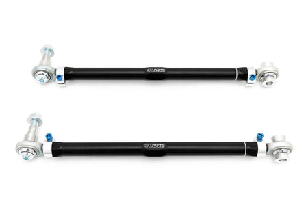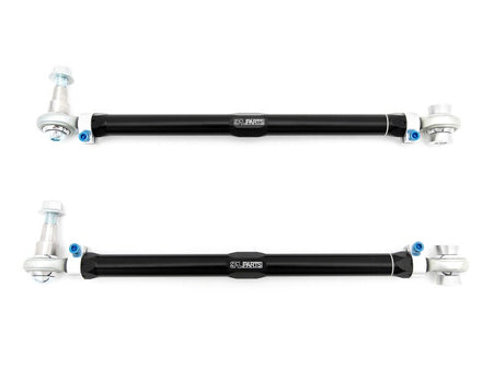 C5 Corvette Rear Toe Arms (RTA) increase stability and response by eliminating bushing deflection while providing an increased range of rear toe adjustment, necessary for lowered cars or for performance alignments.  Even small changes to ride height and camber will affect toe settings, and the wide range of adjustment allows you to maximize grip on a track car and extend tire life on a street car.  Black Anodized and gun drilled 2024 Aluminum main links along with our 360 degree Rotating Clamp design allow for quick and precise adjustment. The Rotating Clamps are tightened with Blue Anodized Titanium Socket Head Cap Screws for easy to access adjustment, and shaves even more unsprung weight, without compromising strength.