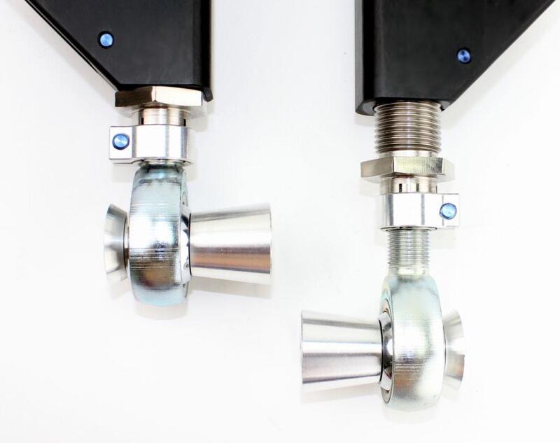 Anti dive adjustment is achieved with Stainless Steel spacers for the forward mounting position of the trailing/caster arm allowing you to raise or lower this pivot point. Roll center correction is achieved with Stainless Steel spacers that work in conjunction with the heat treated 4130 Chromoly Ball Joint Stud, allowing you to lower the ball joint location at the knuckle. Finally, the use of FK Rod Ends and Spherical Bearings eliminates the flex and binding found in the OEM control arms while allowing smooth articulation.