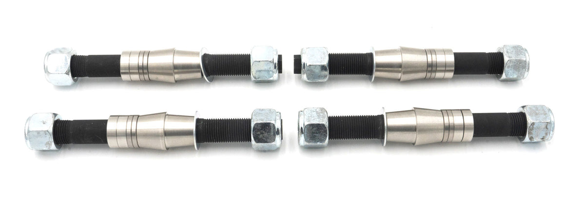 Our stud replacement kit is available for those requiring replacement hardware for their front lower control arm per our TSB 23-01. It includes manganese phosphate coated hardened chromoly steel shank studs, 304 stainless steel adjustment spacers in 1/4" and 1/8" heights, 304 stainless steel adapter spacer bushings, and plated Nylock nuts.