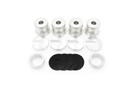 SPL PRO series Bushings are precision CNC machined from 6061-T6 Billet Aluminum for an accurate fit. Kit also includes optional rubber isolation washers to reduce noise transfer from the subframe to the chassis.